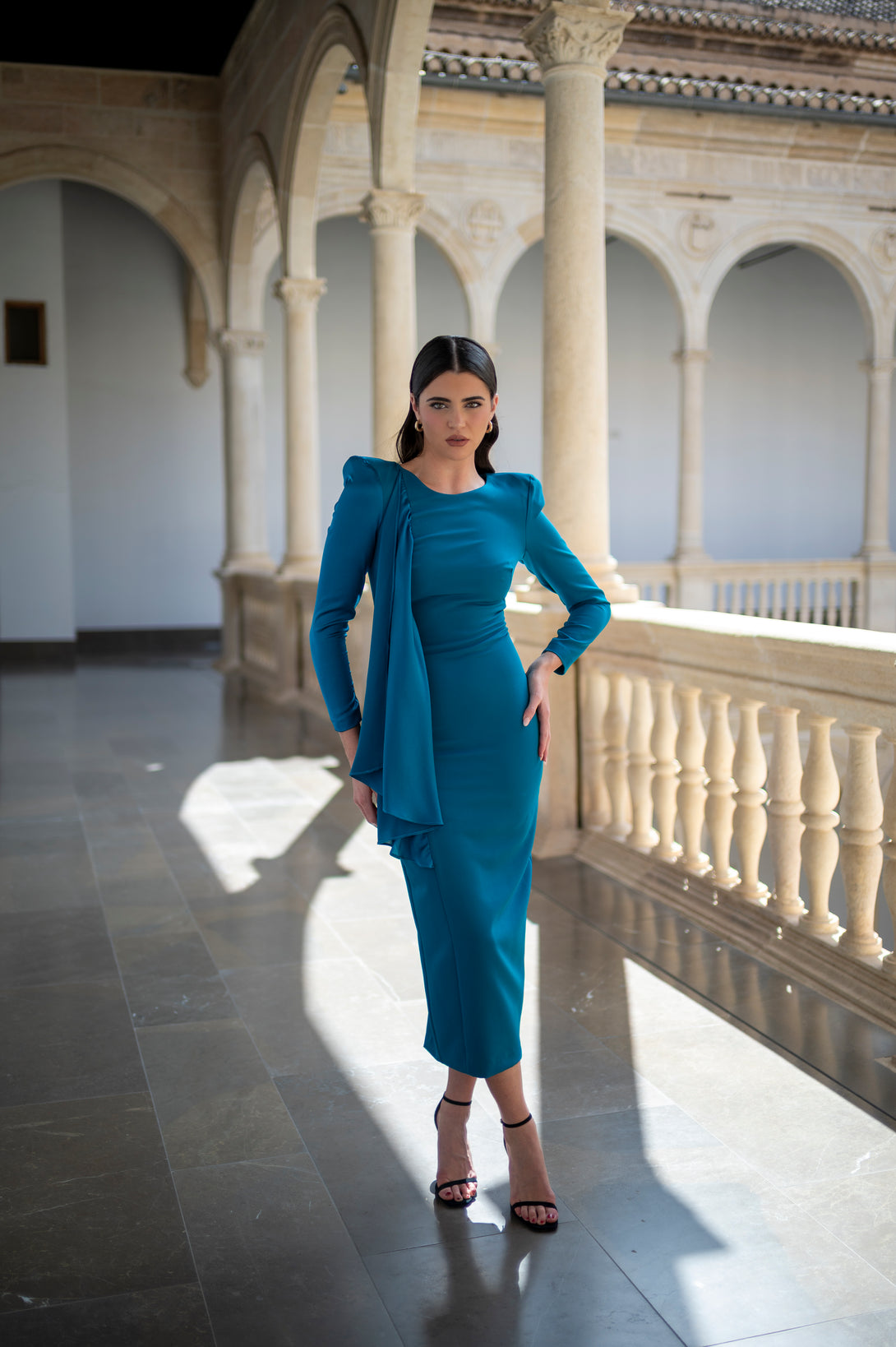 Vestido con escote redondo y delicado detalle de volante en el lateral, que aporta movimiento y un aire femenino. Su diseño versátil lo convierte en la opción perfecta tanto para ocasiones especiales con un toque elegante.