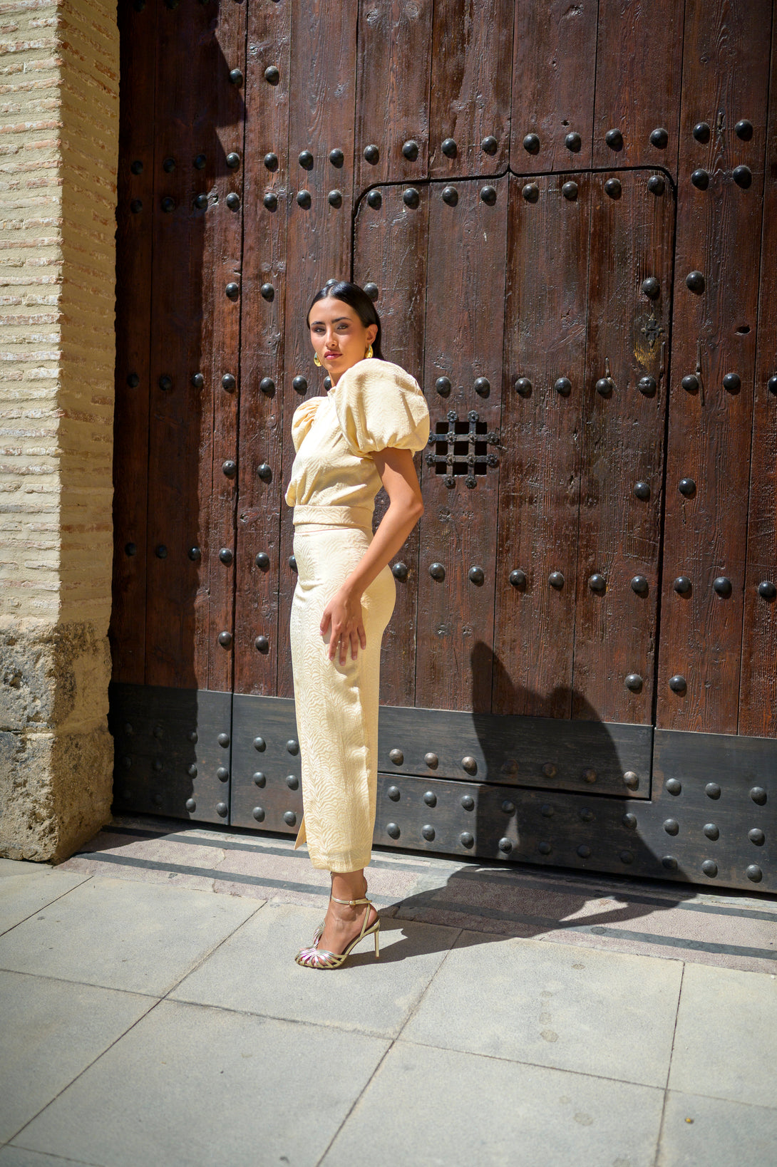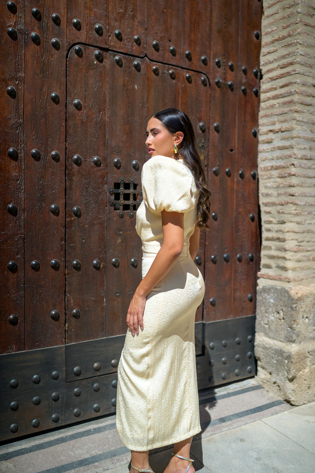 Viste con estilo nuestro conjunto, que incluye una blusa con manga corta abullonada y una falda recta con cintura marcada y abertura delantera.