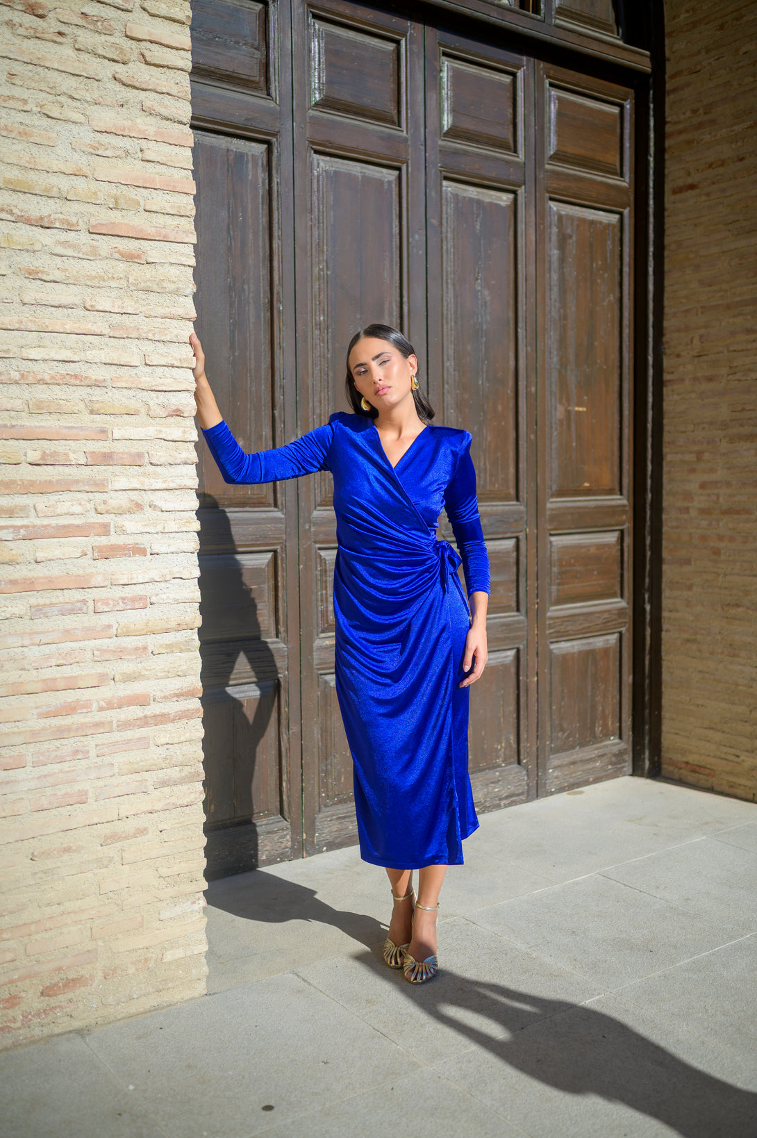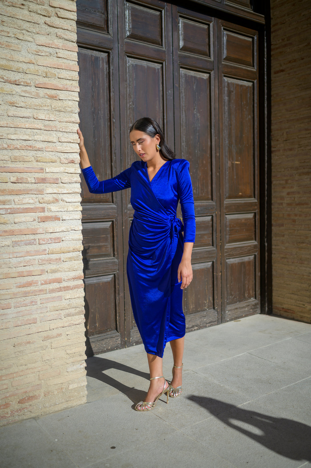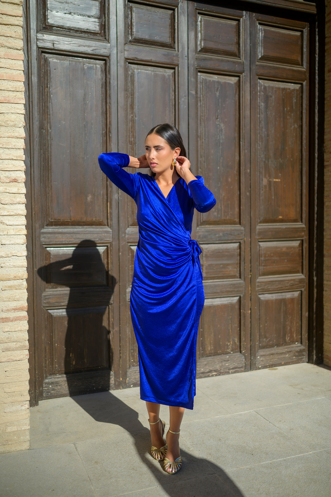 Vestido midi con manga 3/4 y escote cruzado terminado en nudo lateral.