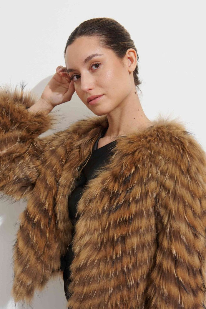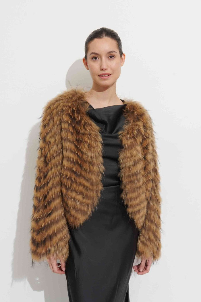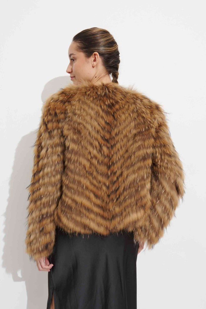 Chaqueta confeccionada en 100% pelo natural de marmota, reconocida por su suavidad y volumen excepcional. Su diseño con efecto rayado aporta un atractivo visual similar al animal print, brindando un aire sofisticado y lleno de personalidad. Con un corte recto y cuello redondo, resulta una prenda versátil, ideal tanto para ocasiones elegantes como para dar un toque distintivo a los looks cotidianos de invierno. Una pieza que une calidez, estilo y exclusividad.