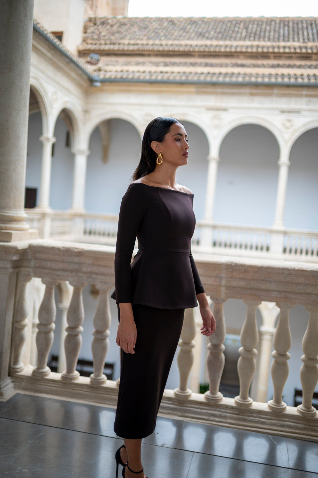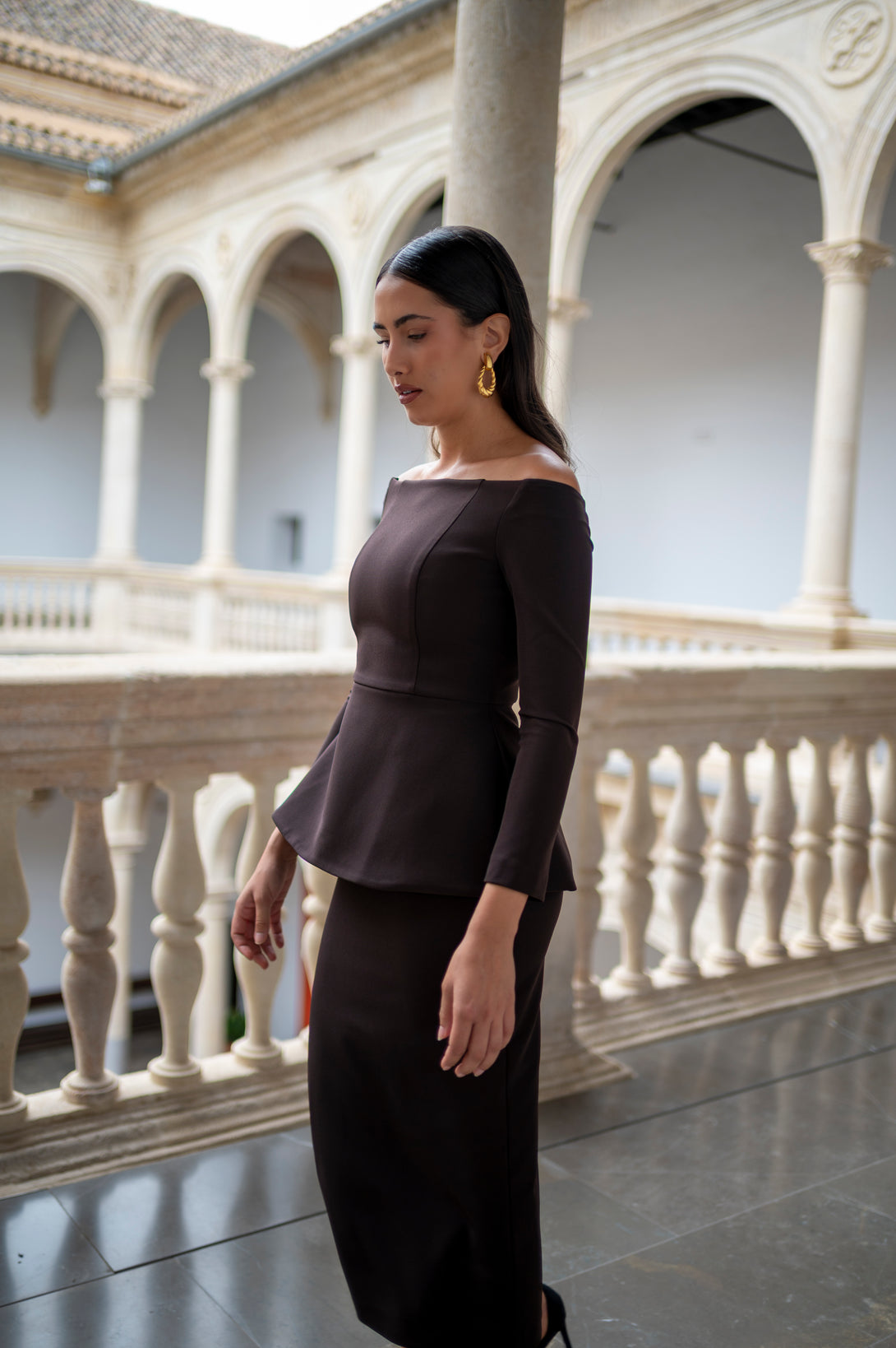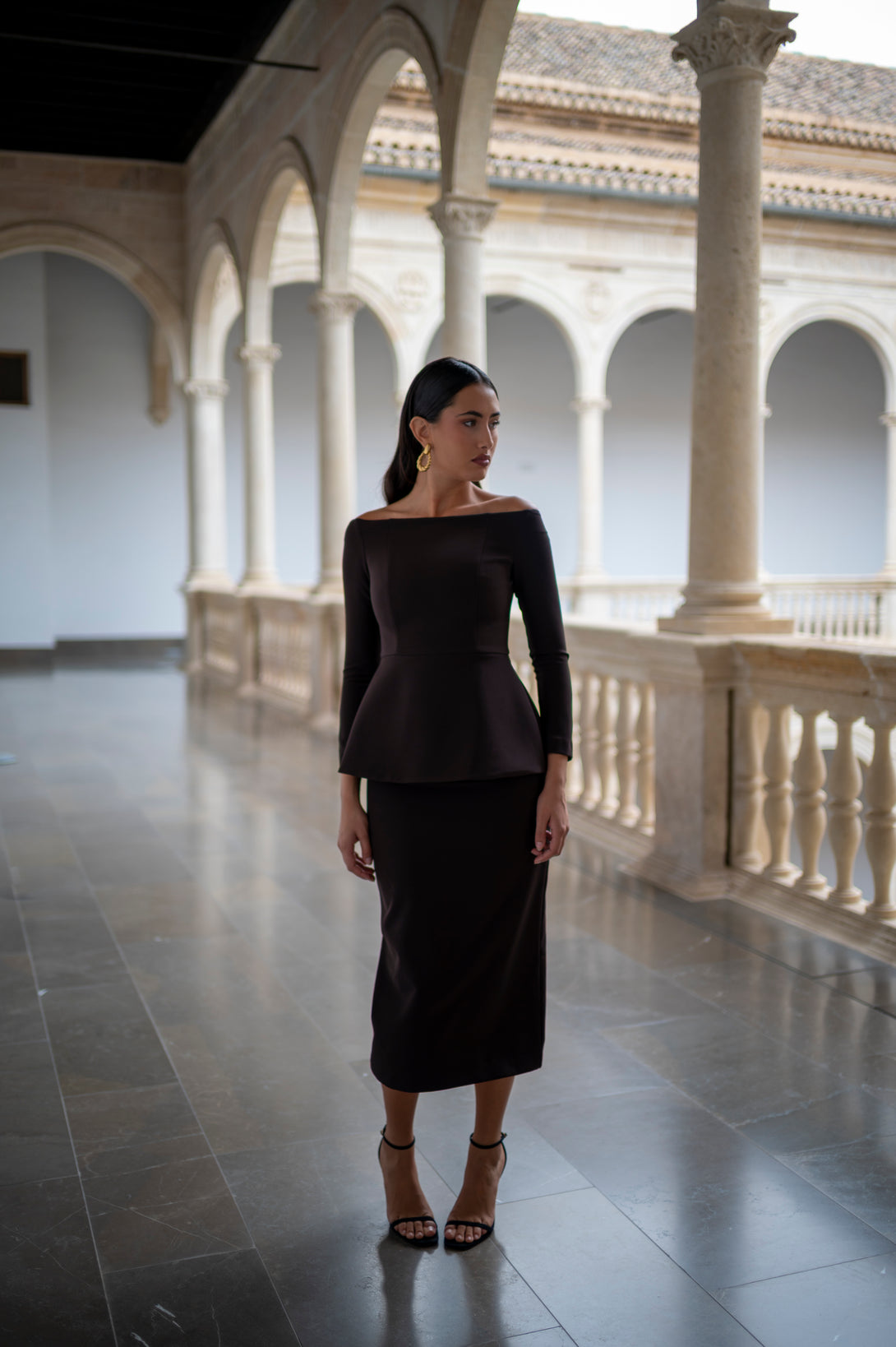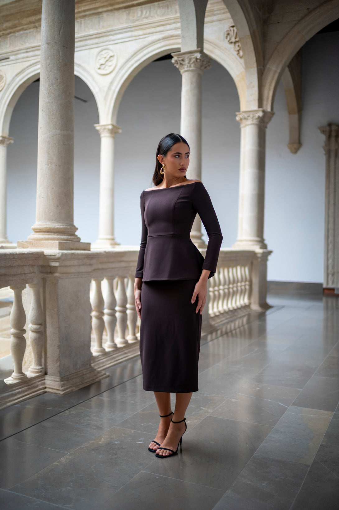 Conjunto Elvira confeccionado en crepe. Lo conforma un top con escote barco, mangas y peplum en cintura que estiliza la figura, junto con una falda midi y abertura trasera.