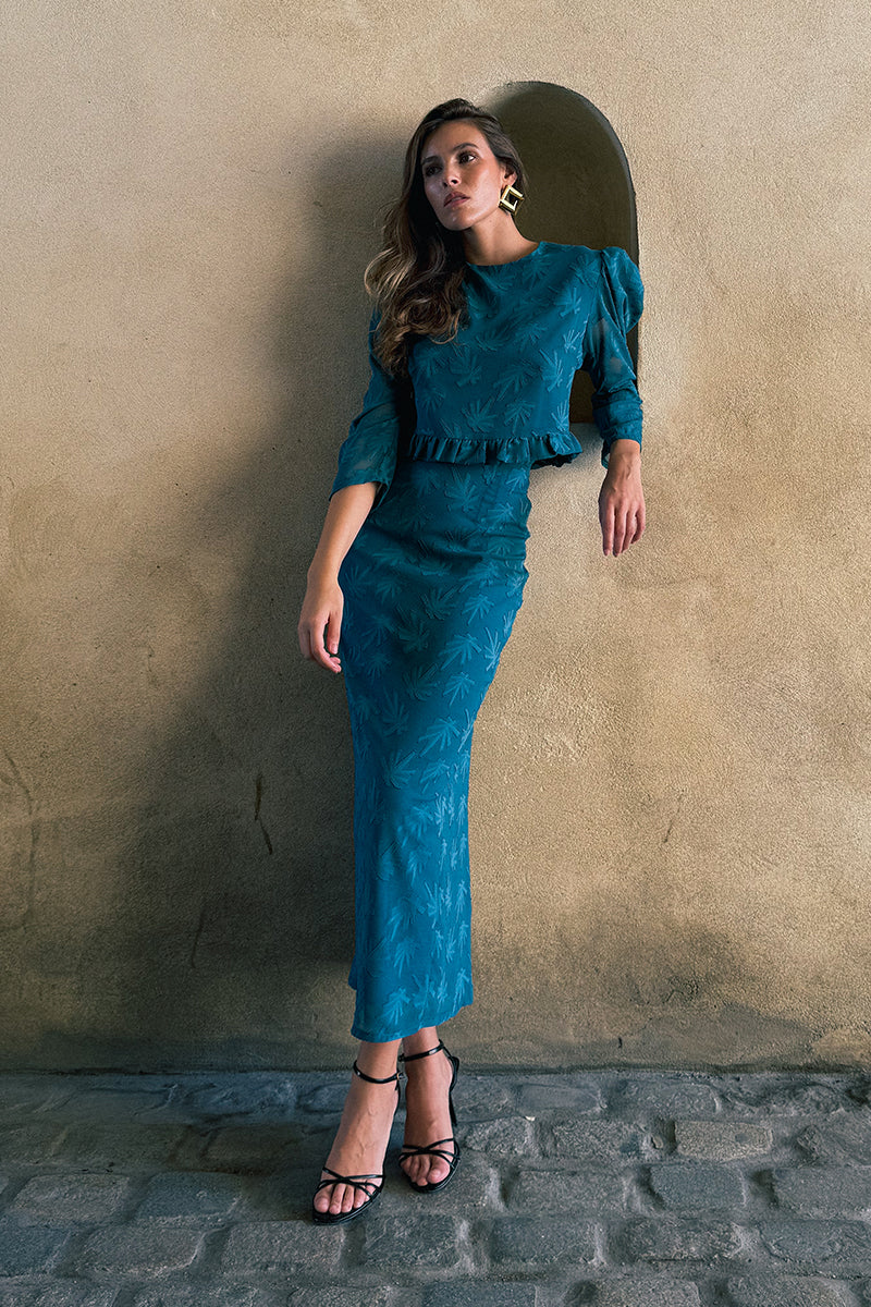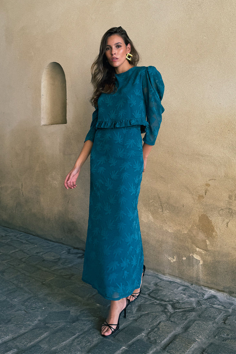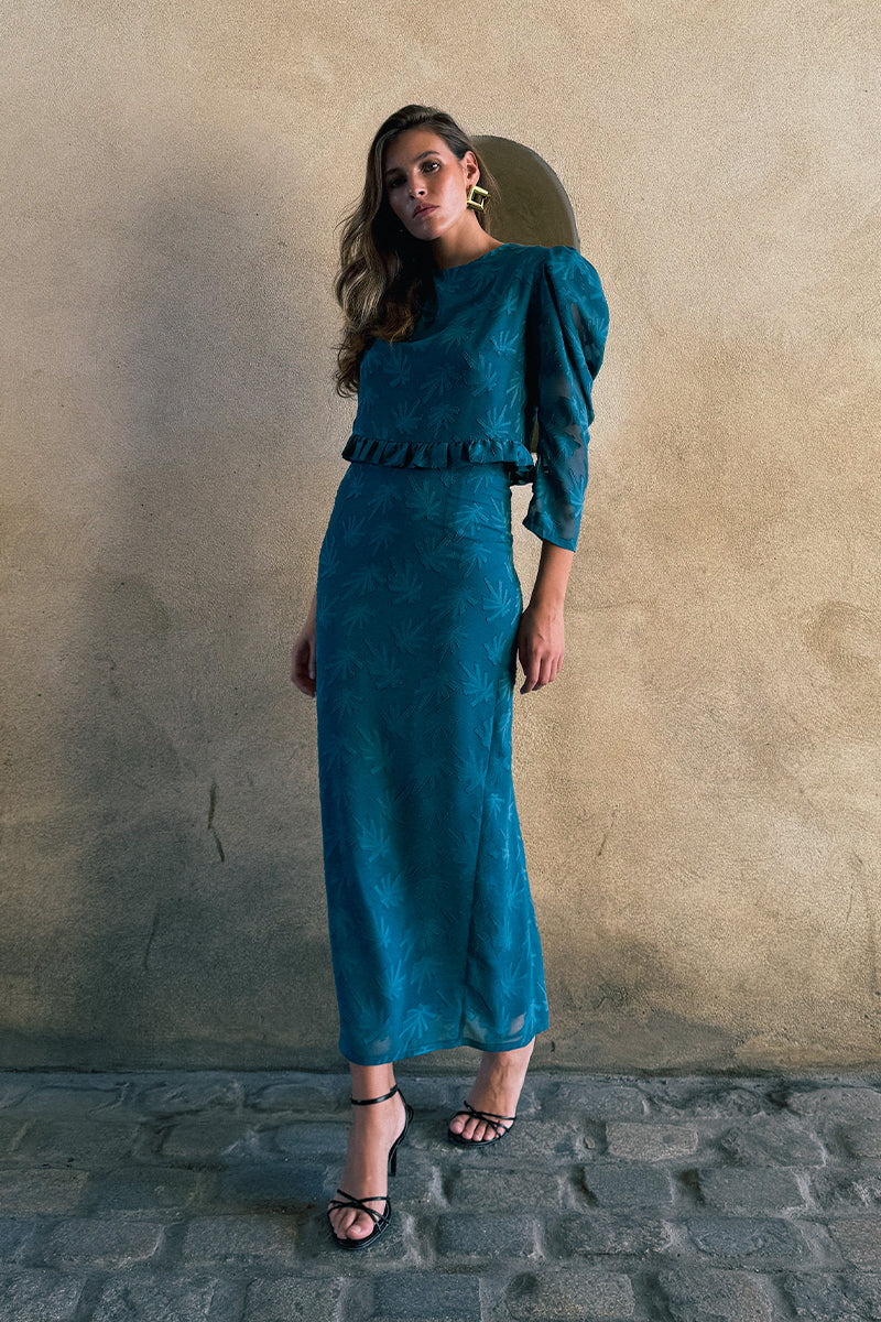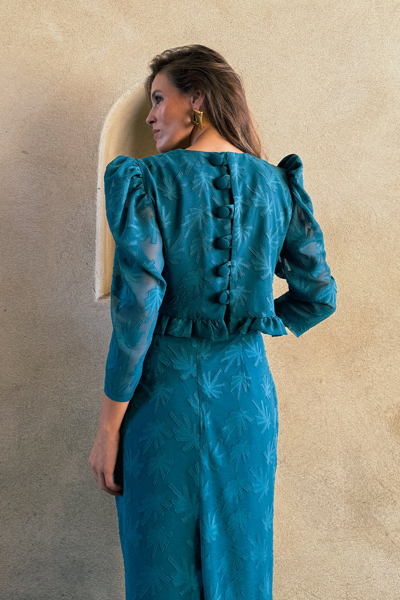 Este conjunto de gasa brocada es la opción perfecta para un look sofisticado y elegante. La blusa, con mangas abullonadas y un delicado detalle de mini volante, aporta un toque romántico y moderno, mientras que la falda midi complementa el conjunto.
