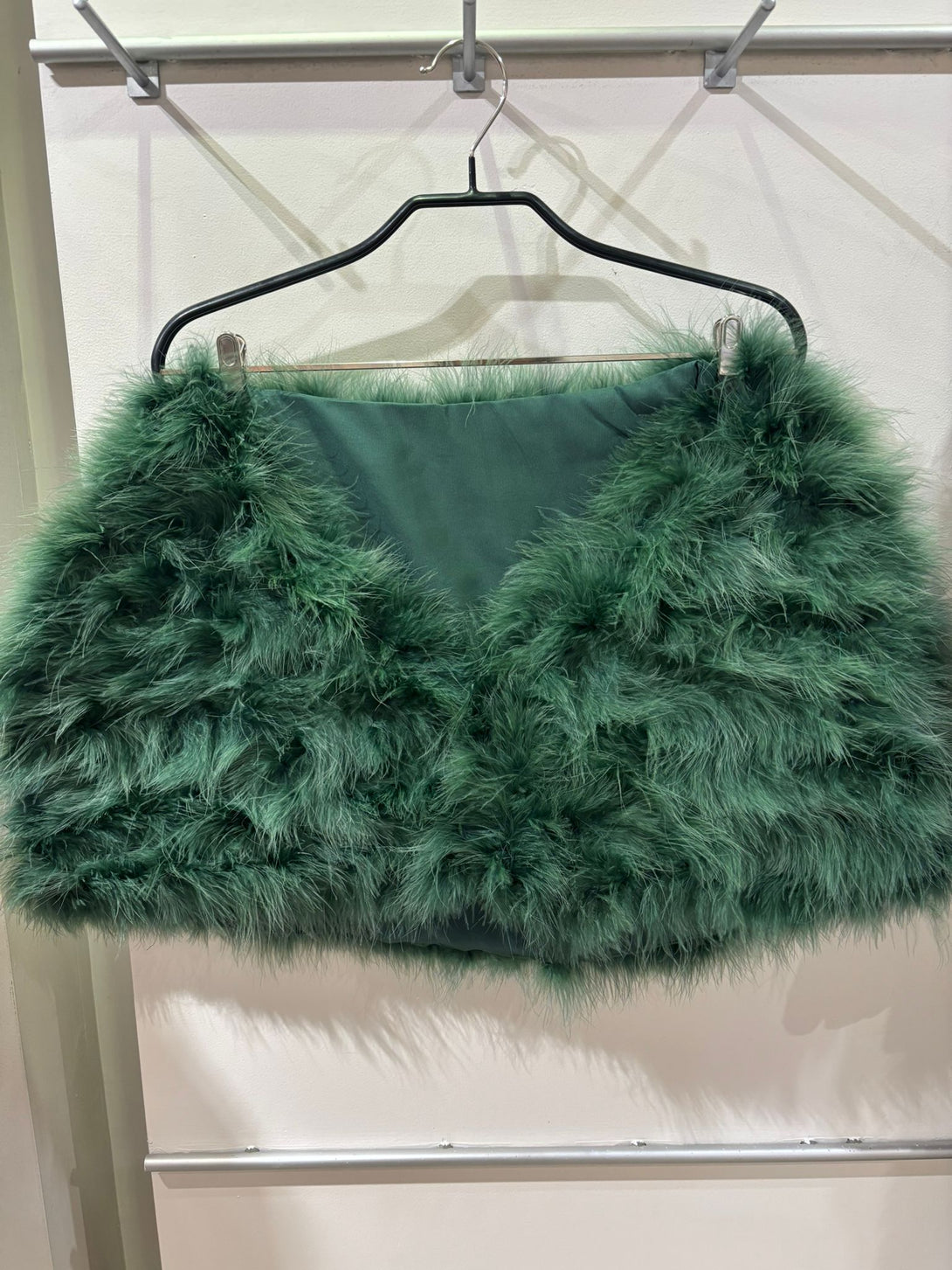 Estola de pluma natural de tipo capa con doble cierre en forma de enganche.