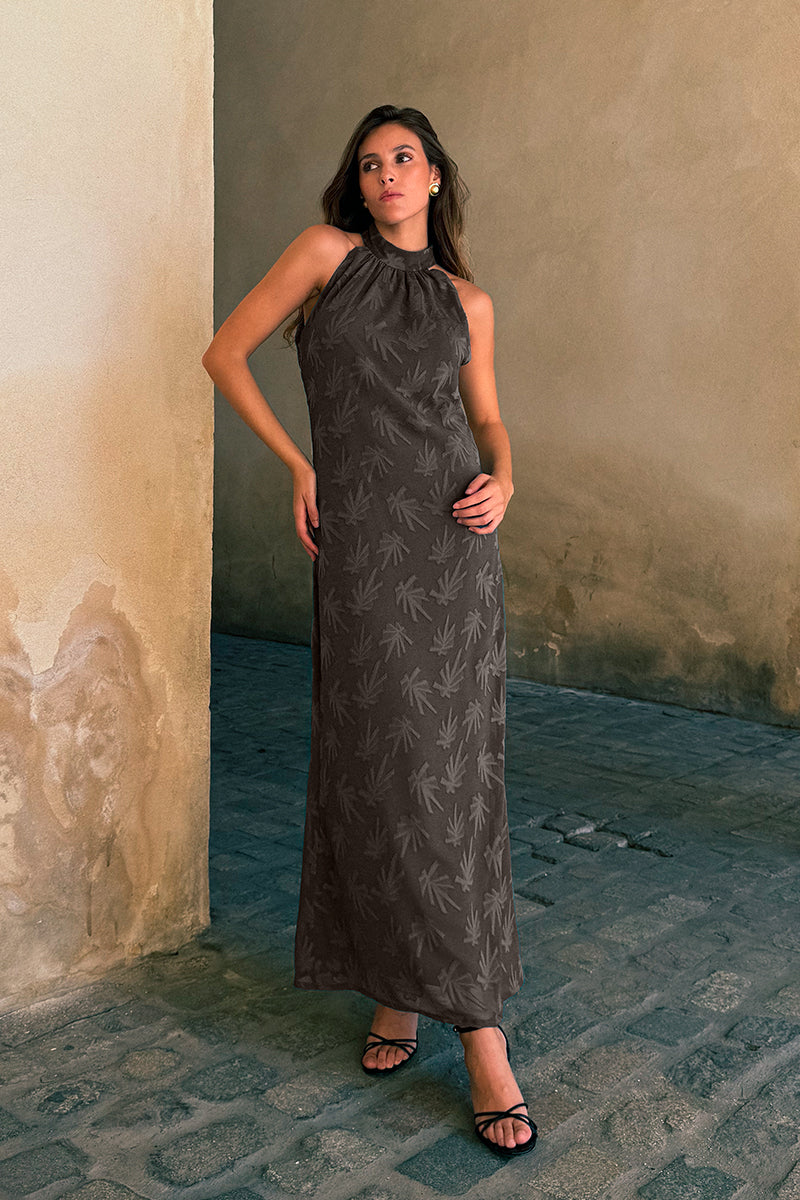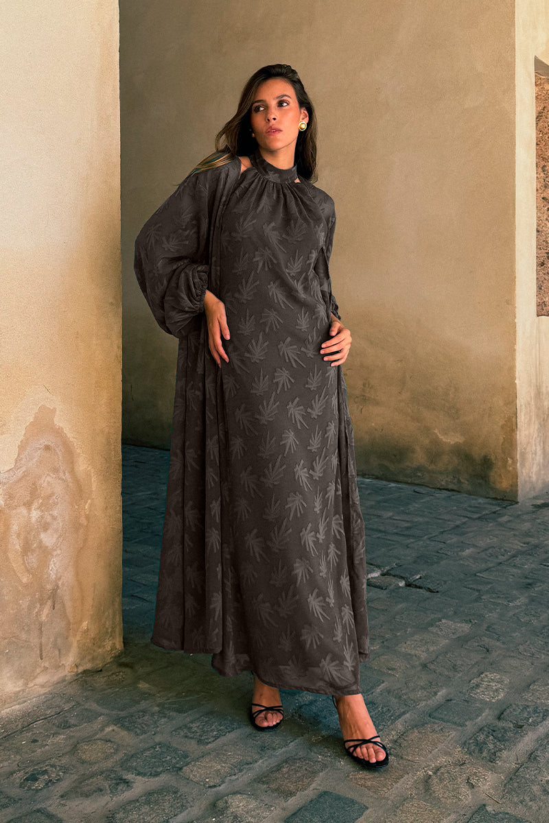 Conjunto compuesto por kimono de mangas largas abullonadas y vestido de largo midi con escote halter.