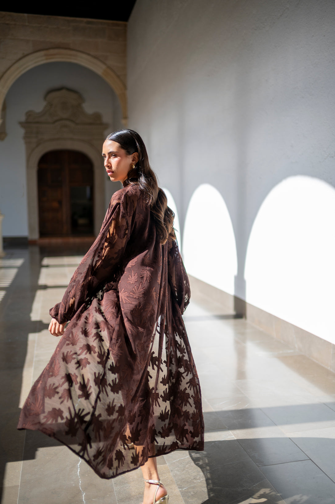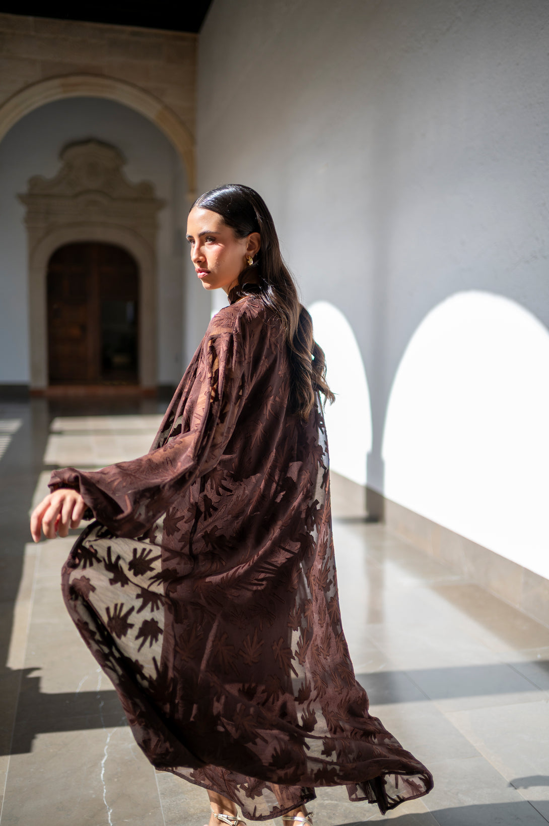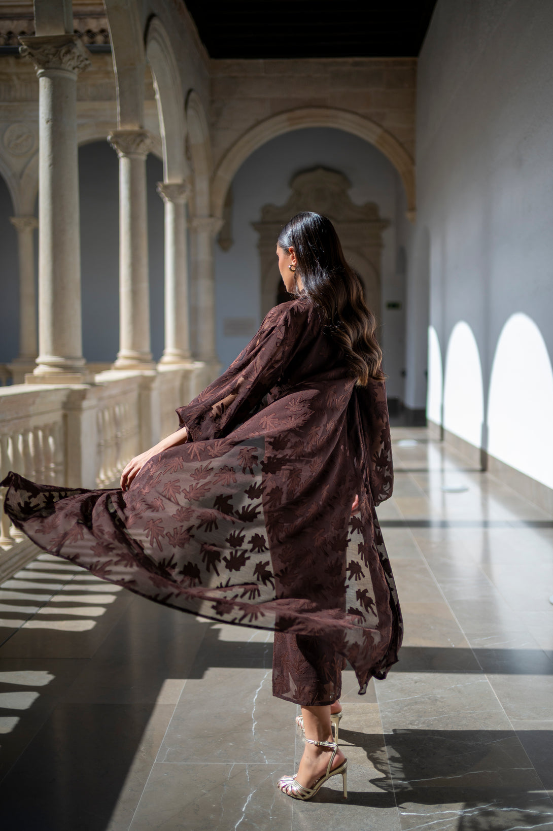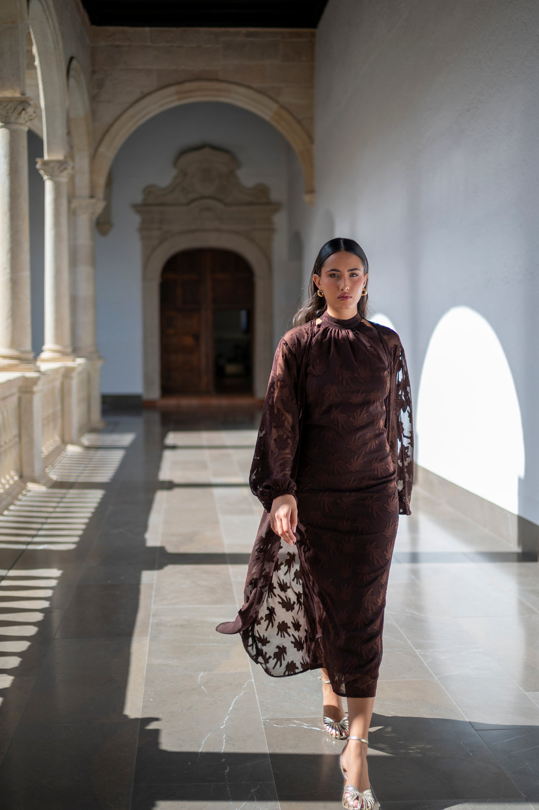 Conjunto compuesto por kimono de manga larga abullonada y vestido de largo midi con escote halter.