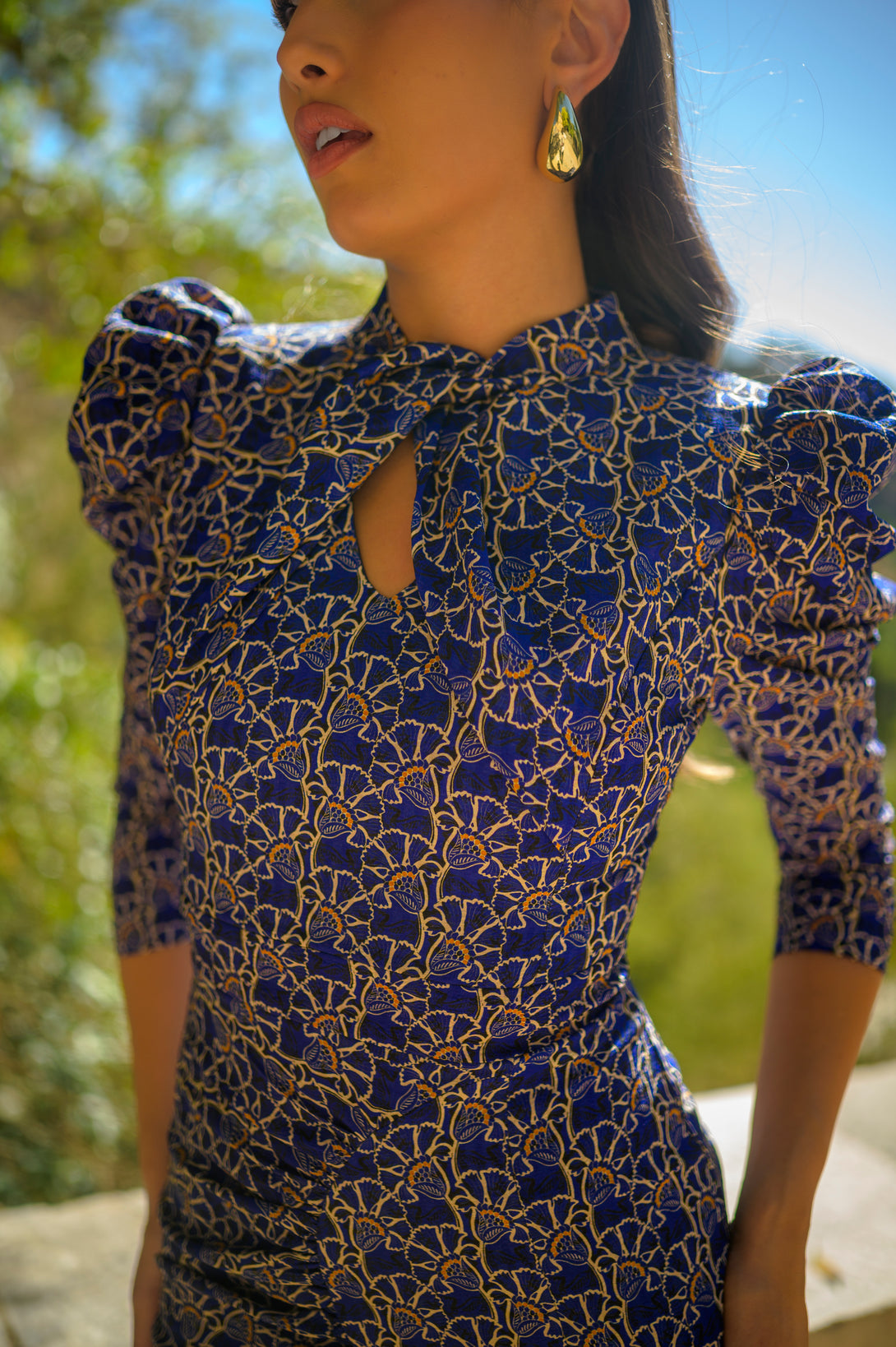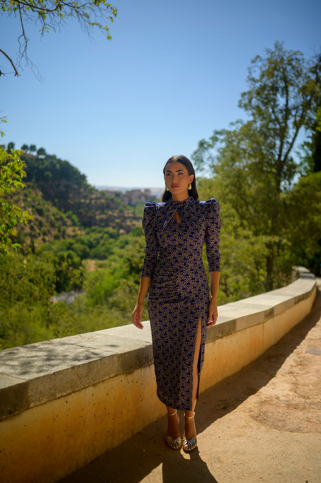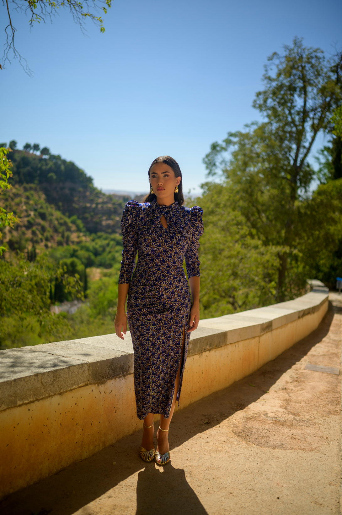 Vestido midi estampado con manga abullonada y espalda con escote en pico. Lleva forro. La modelo lleva la talla 36.