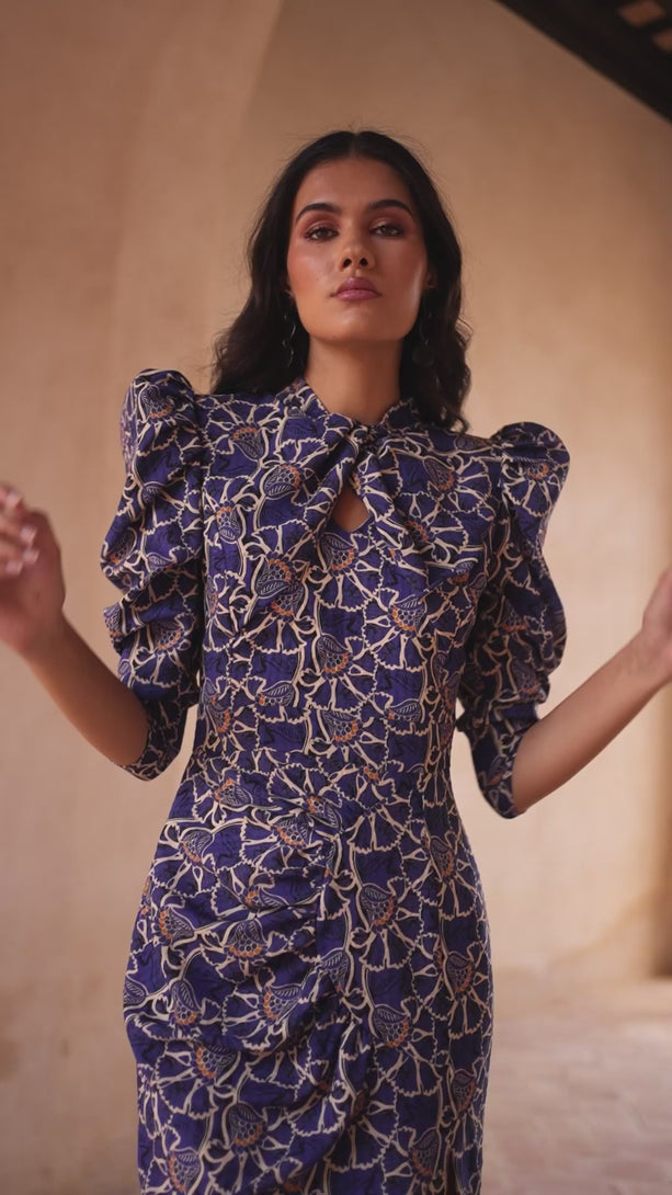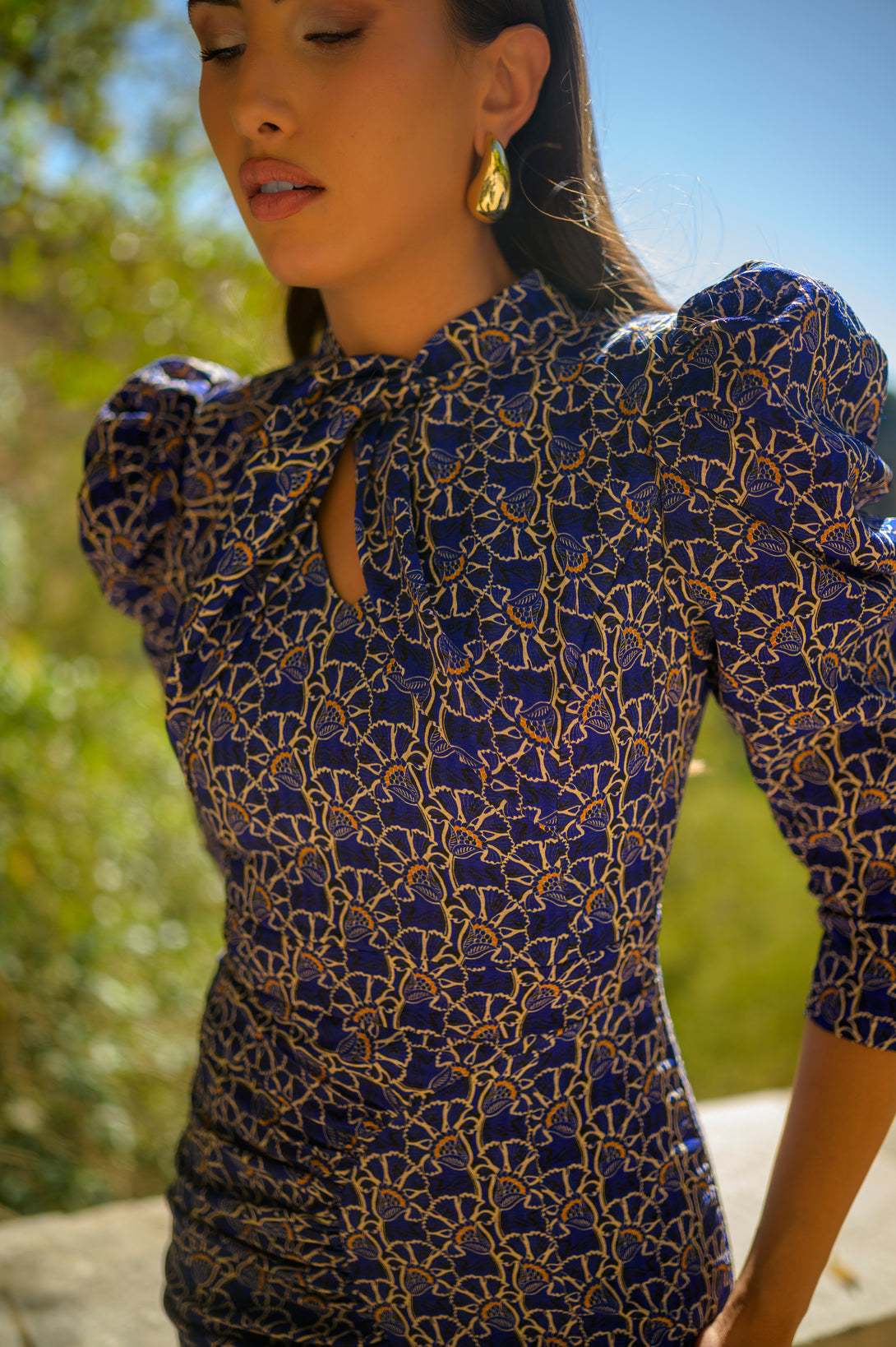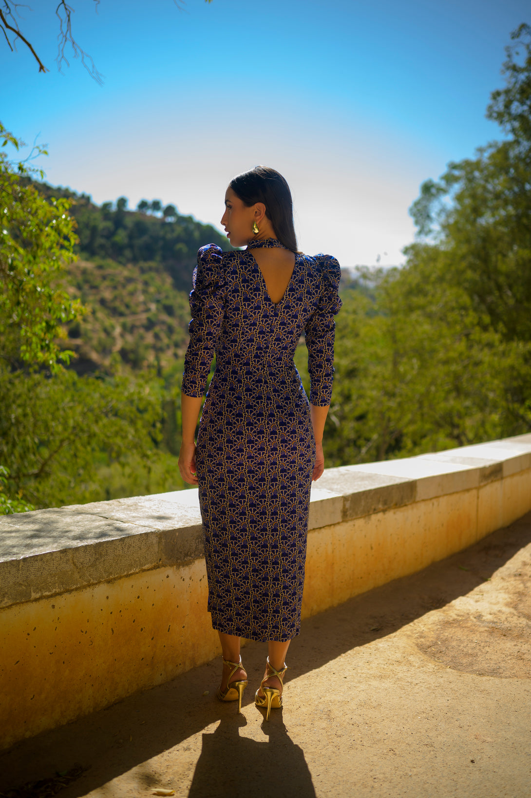 Vestido midi estampado con manga abullonada y espalda con escote en pico. Lleva forro. La modelo lleva la talla 36.